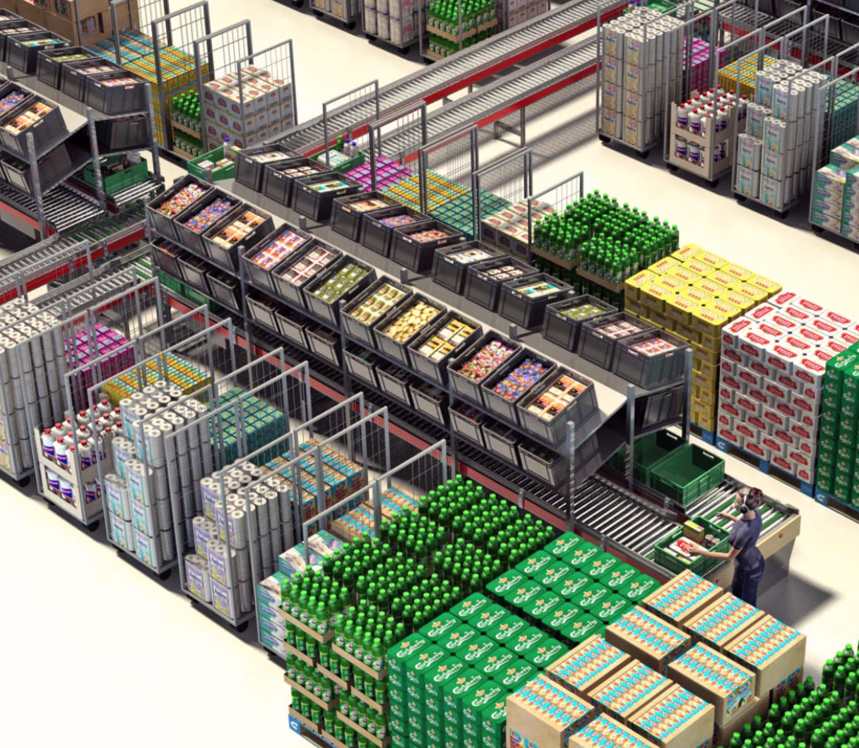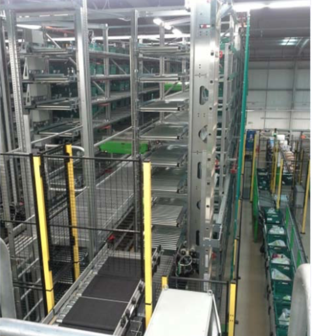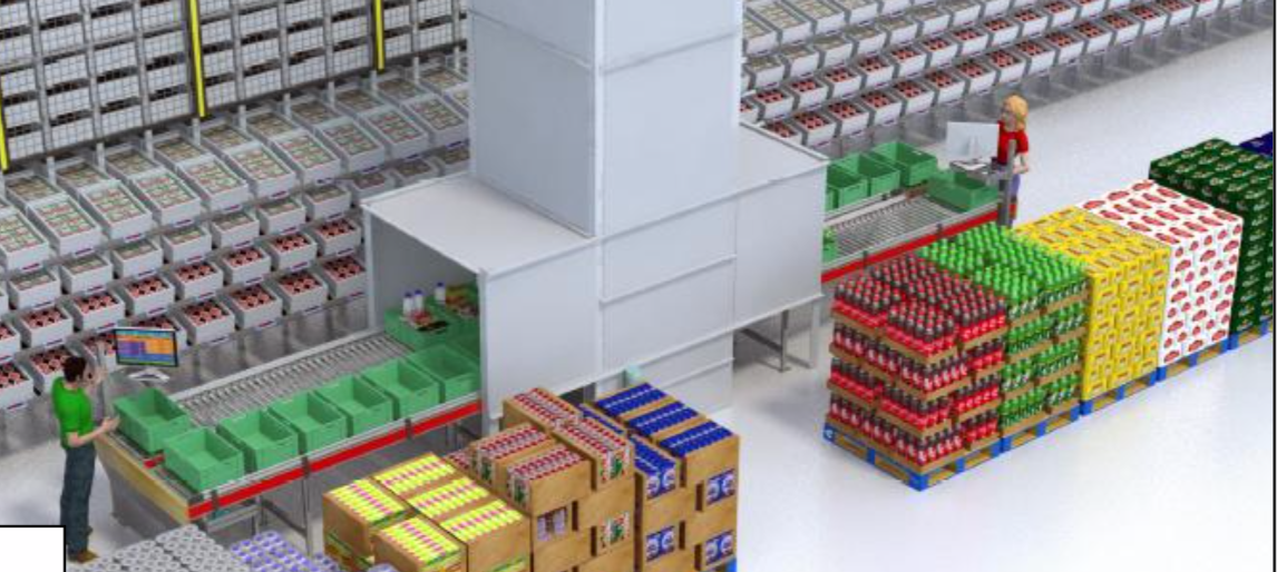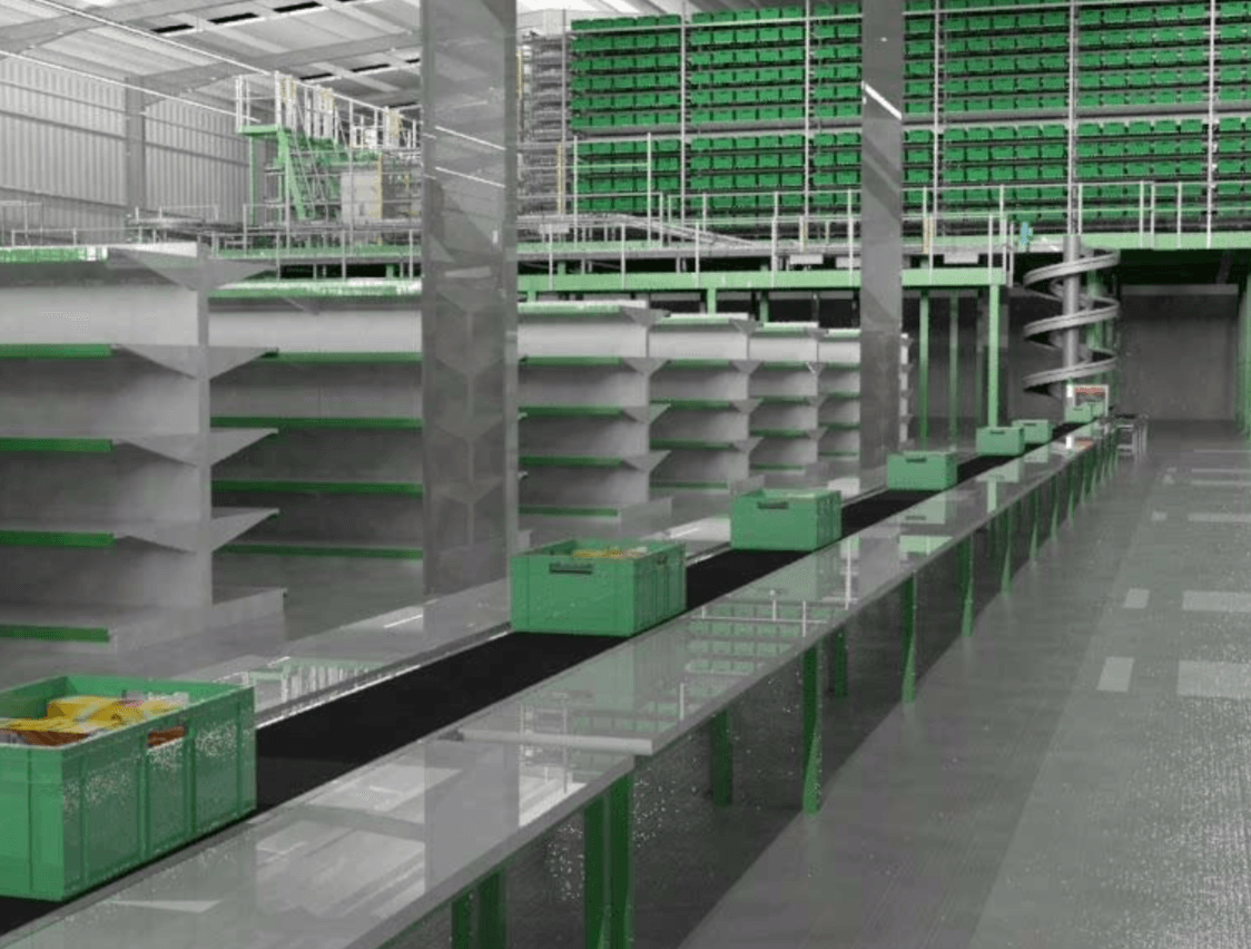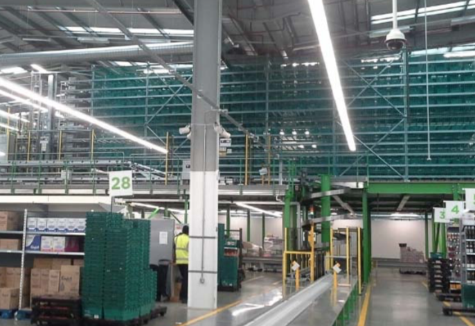 - Totes routed to Zone picking lanes (fresh) and Goods to Person pick stations (ambient) on mezzanine floors.